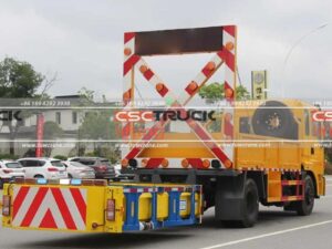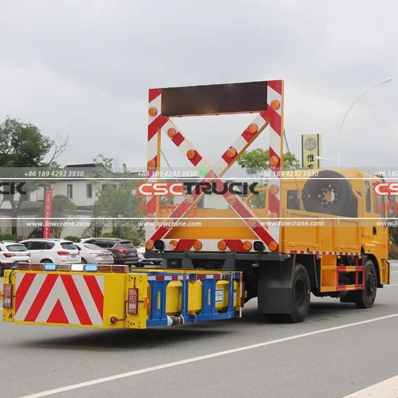 - የተሻሻለ ደህንነት: The anti-collision buffer car module integrated into the tow truck is a key safety feature. It plays a crucial role in highway and road construction scenarios by providing a buffer guard to protect construction work vehicles and personnel. The anti-collision buffer cushion and guiding sign frame create a protective zone that absorbs collision energy and minimizes the impact on both personnel and equipment, contributing to overall safety during construction operations.