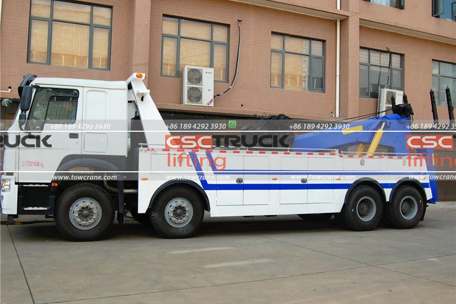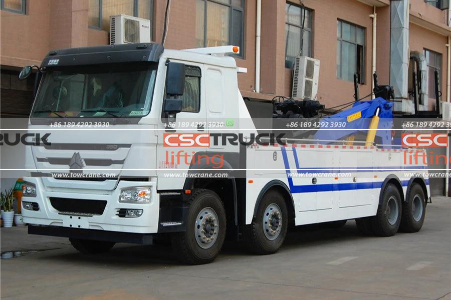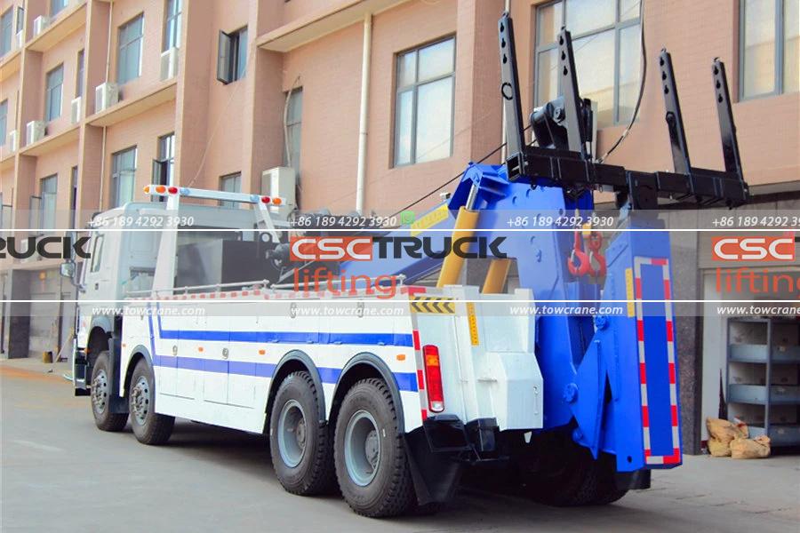 Tus HOWO Heavy Wrecker Tow Recovery Truck is a robust and versatile vehicle designed for towing and recovering breakdown cars, tsheb, buses, and trailers on the road. With a rising number of private vehicles, this recovery truck is extensively used by governmental organizations and towing companies. This heavy-duty recovery truck is available with optional brands such as HOWO, Dongfeng, Isuzu, JAC, JMC, Cov duab, Shacman, thiab ntau dua. It features high-quality spare parts, including Italy-brand multi-way valves and balance valves, German Roxroth technology hydraulic cylinders and joints, imported sealing elements, and reinforced checked plates.