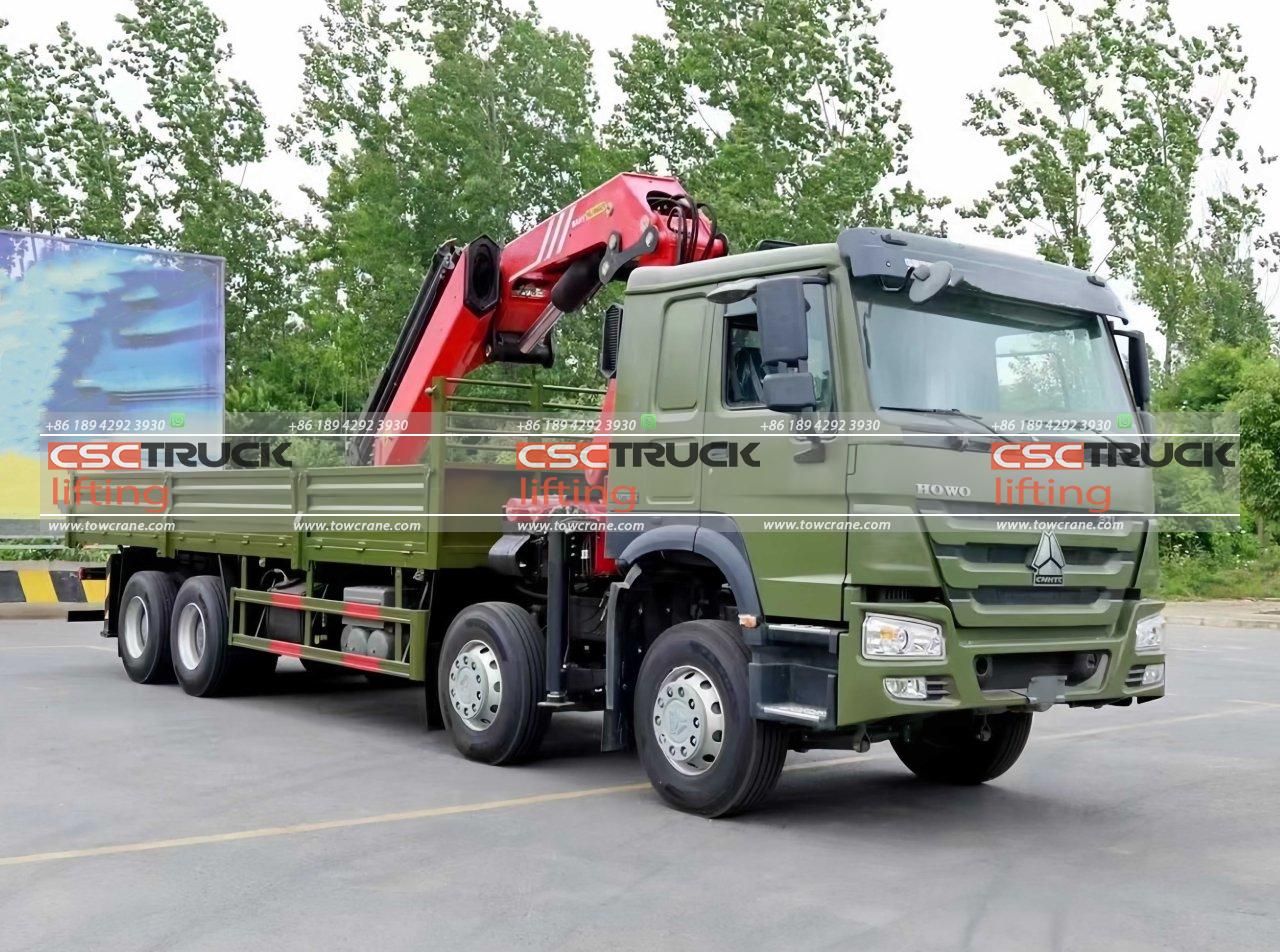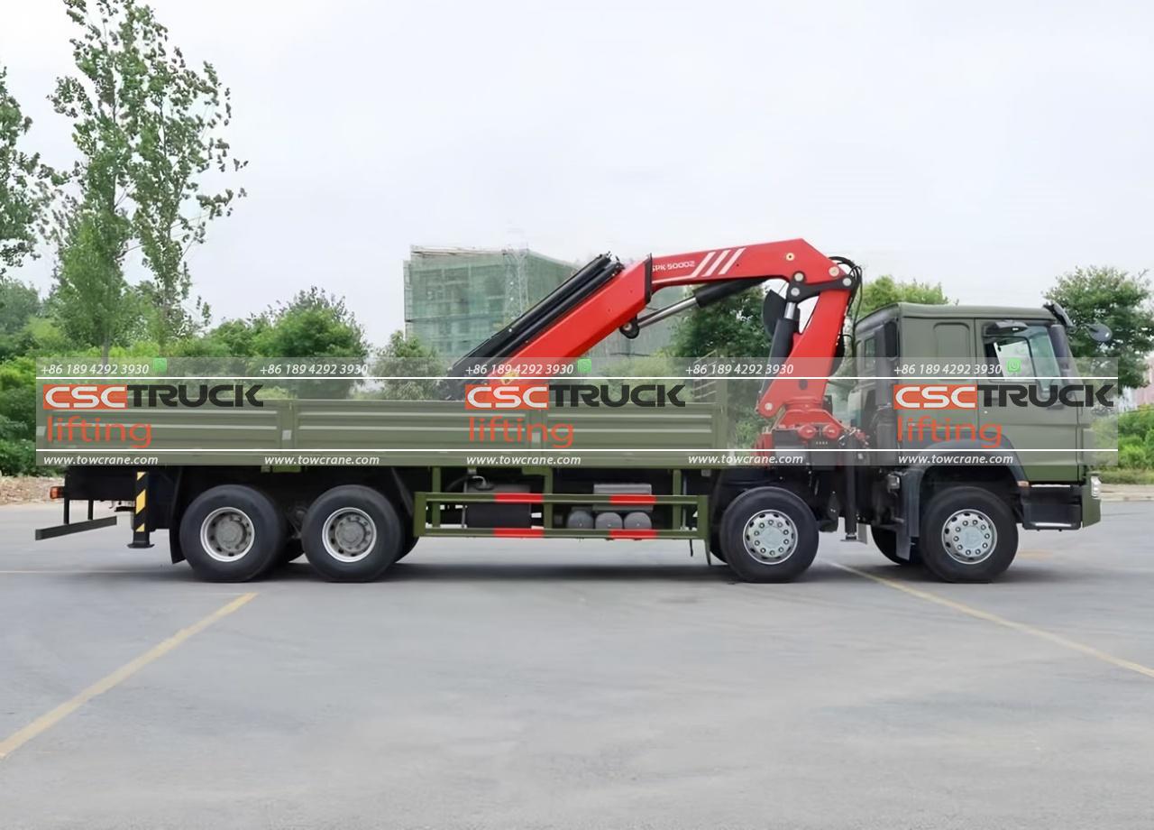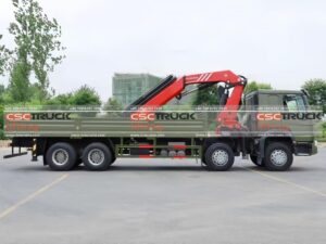 The 12-wheeler 16-ton knuckle boom crane за CSCTRUCK Tow Crane is a robust and versatile machine designed for heavy-duty lifting tasks. Built on a sturdy HOWO chassis with an 8×4 drive type, this crane ensures exceptional stability and mobility, even in challenging terrains. The crane is equipped with 3 hydraulic boom extensions, providing a maximum hydraulic outreach of 10 метрів. This capability, combined with a 49-meter-ton lifting moment, allows for precise and efficient handling of heavy loads.